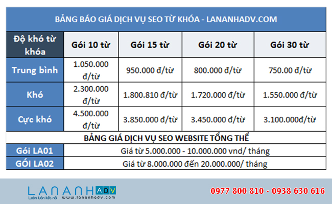 Cách tính giá dịch vụ seo từ khóa website sẽ có nhiều gói dịch vụ khách nhau tùy vào mỗi lĩnh vực sẽ có giá khác nhau. Lan Anh Adv gửi bảng báo giá quý khách hàng tham khảo. Liên hệ 0977800810 hoặc 0938630616 đề được nhân viên tư vấn chi tiết.